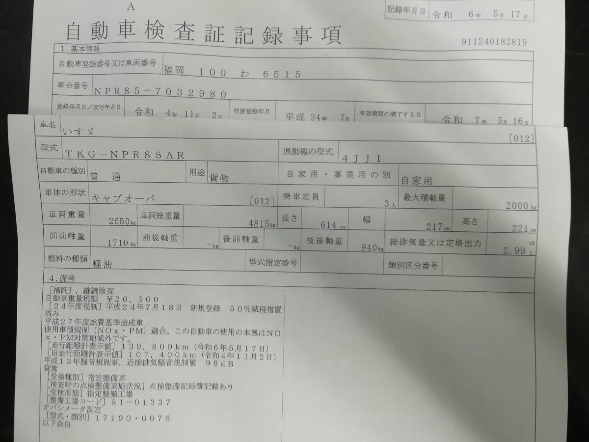 型 式 | TKG-NPR85AR | 車台番号 | NPR85-703**** | ||||||||||||