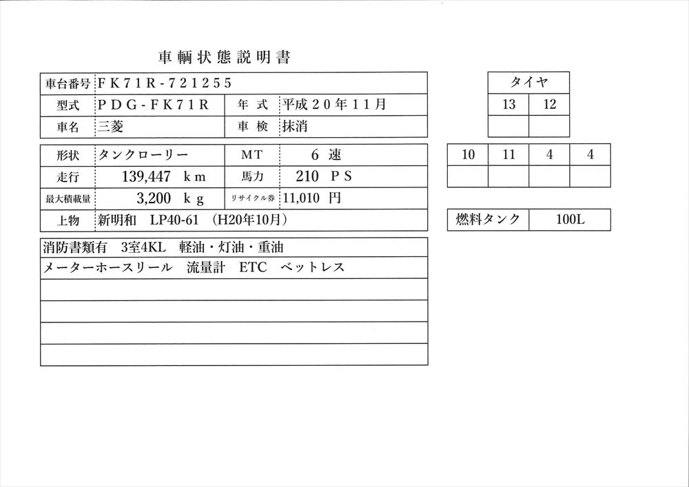 | 形状詳細 | タンクローリー | 積載量 | 3,200 kg | ||||||||||||