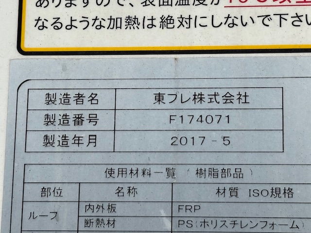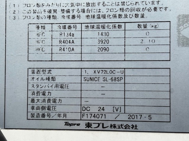 東プレ XV72L0C-U -30℃設定 3時間で-10.5℃確認済(8月測定) 床形状:アルミ縞板 S/D付(幅900mm×高2010mm) ラッシング2段