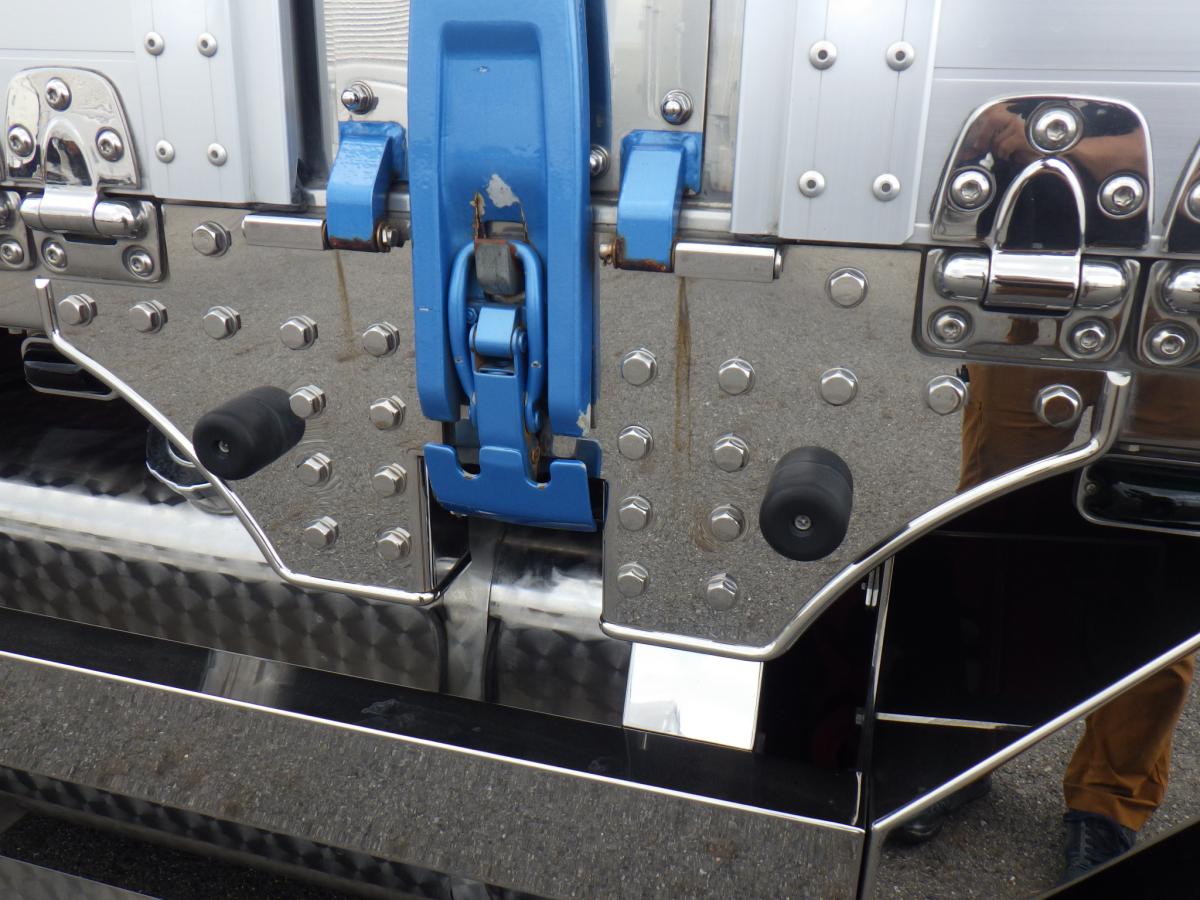 ラッシングレール2段 内フック12対 中柱回転式 インターロック、ウイングスイッチ前後有 門口、蝶番、キャッチ、ロックバーステンレス セイコーラックステンレス