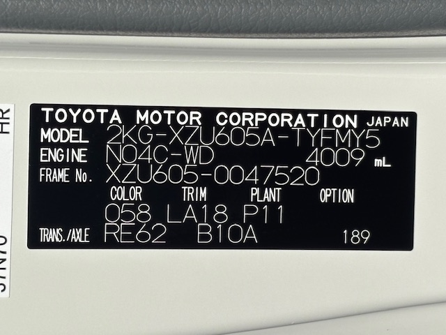| 型 式 | 2KG-XZU605A | 車台番号 | XZU605-004**** | ||||||||||||