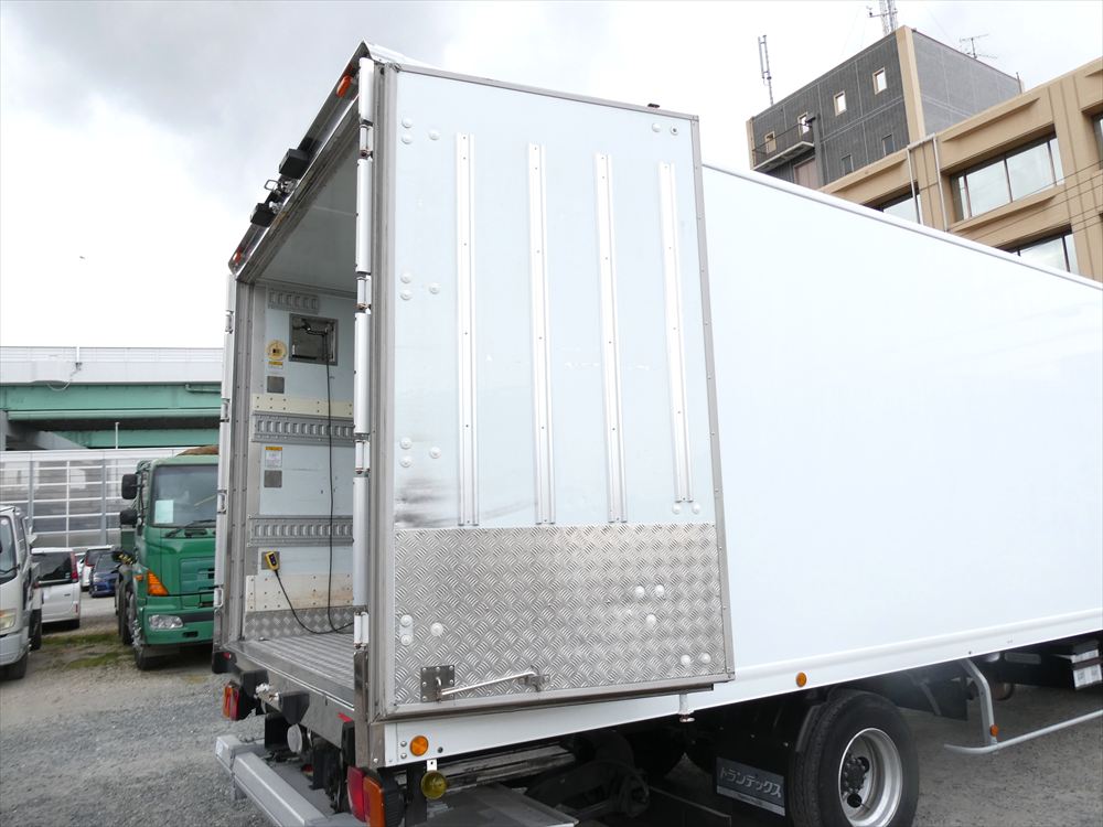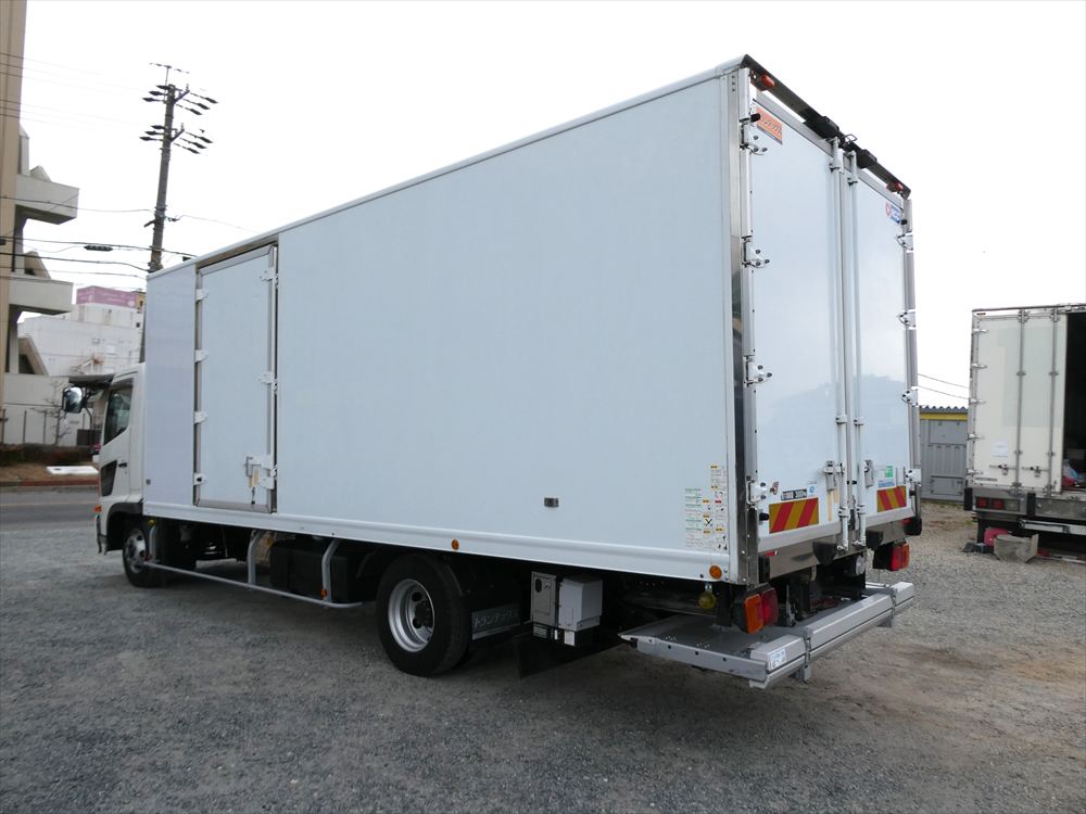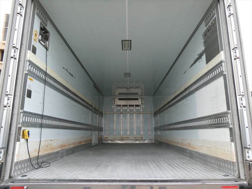 型式 TKG-FC9JKAA 車台番号 FC9JKA-16427 ワイド ボデー内寸 L6.18m W2.26m H2.1m 格納パワゲート 新明和 冷凍機:菱重 TDJS50A-L2 上物箱:トランテックス 床アルミしま板 バックモニタ ETC |