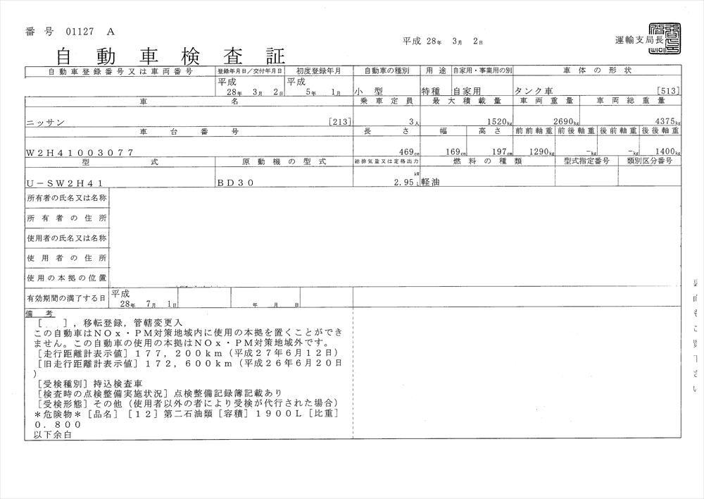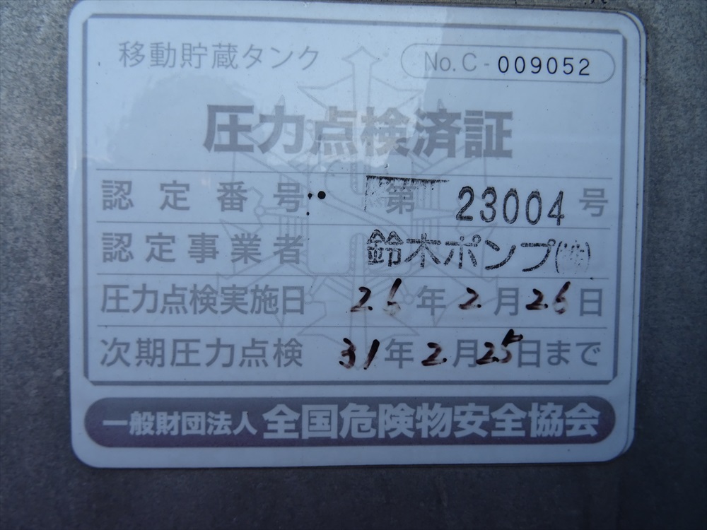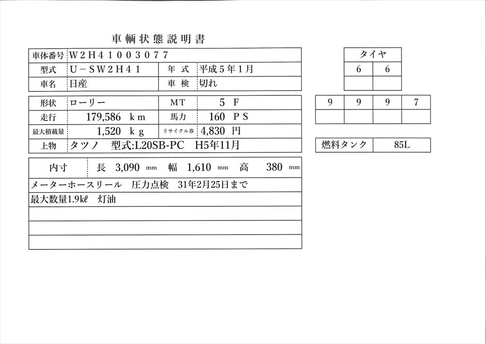 | 形状詳細 | タンクローリー | 積載量 | 1,520 kg | ||||||||||||