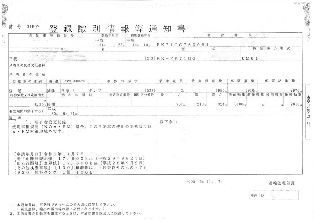 | 型 式 | KK-FK71GG | 車台番号 | FK7**** | ||||||||||||