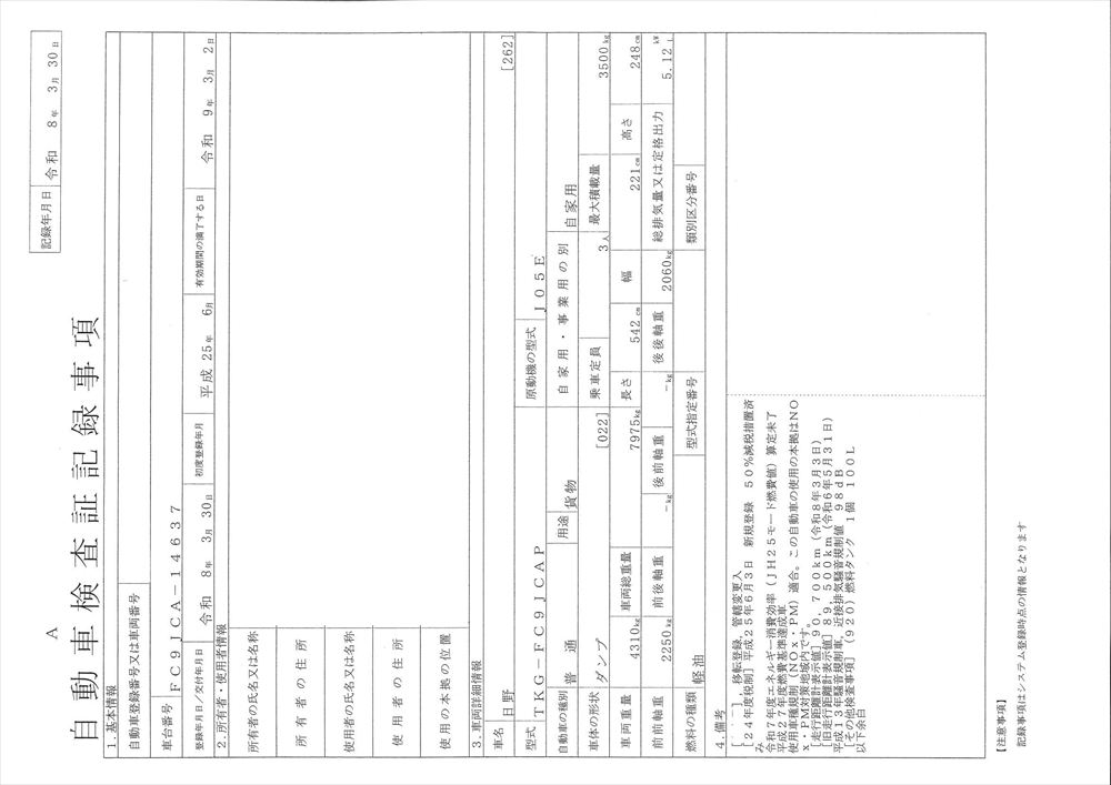 | 型 式 | TKG-FC9JCAP | 車台番号 | FC9**** | ||||||||||||