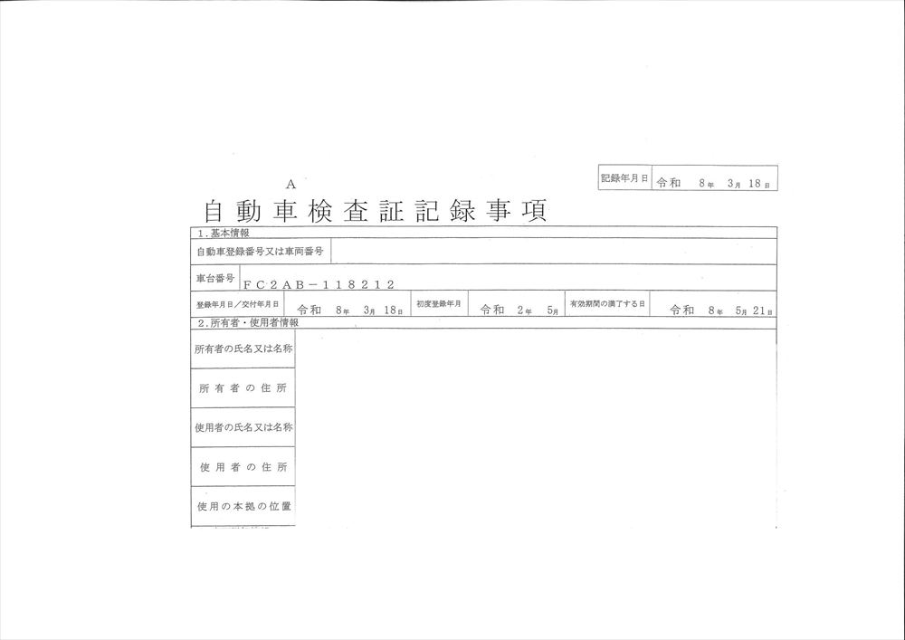 | 型 式 | 2KG-FC2ABA | 車台番号 | FC**** | ||||||||||||