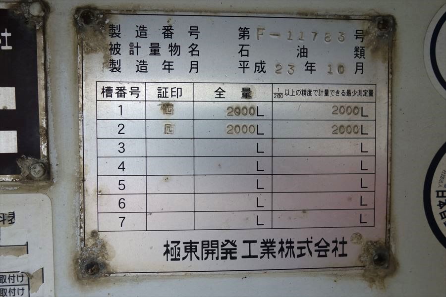 タンクローリー 極東 型式LS04-30 4KL 品名 第2石油類4000L 灯油0.80 軽油0.85 メーターホースリール ベットレス |