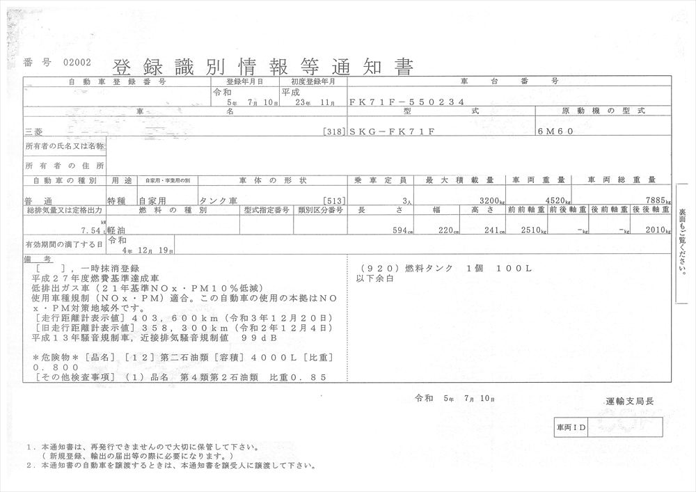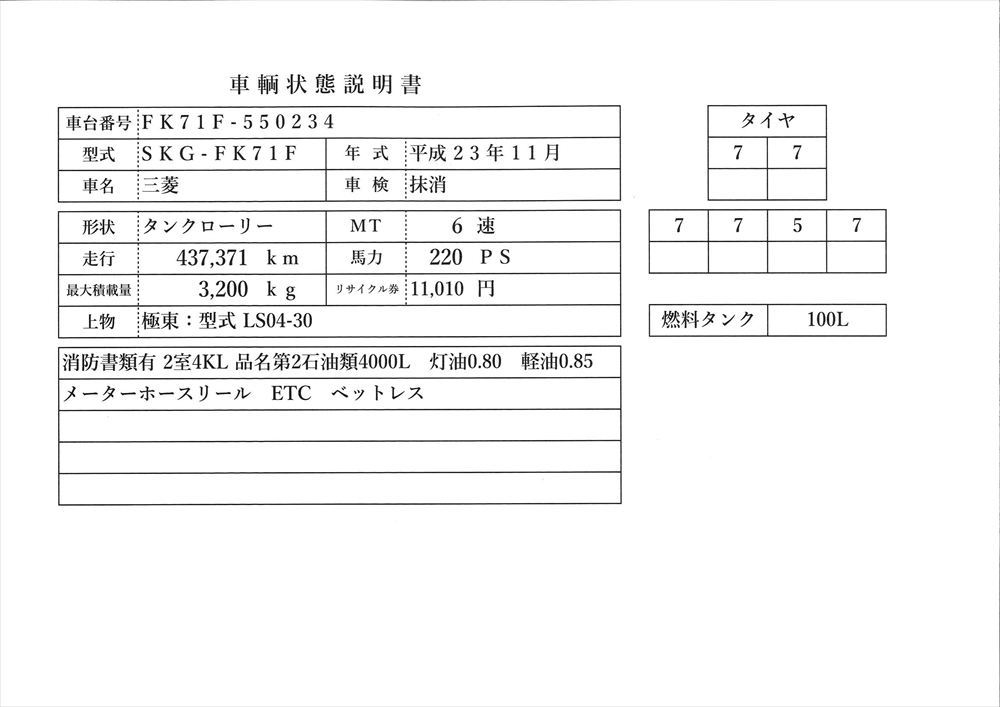 | 形状詳細 | タンクローリー | 積載量 | 3,200 kg | ||||||||||||
